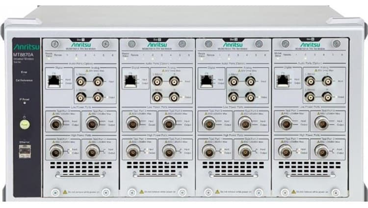 The MT8870A is a measuring instrument for mass-production of wireless communication devices, including 2G/3G/LTE/LTE-A, W-LAN, Bluetooth, GPS, FM, etc., technologies. Up to four high-performance test units can be installed in one main chassis, with each unit performing completely independent parallel measurements to evaluate up to four wireless communications devices simultaneously.